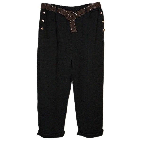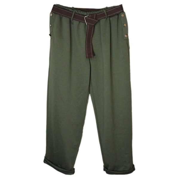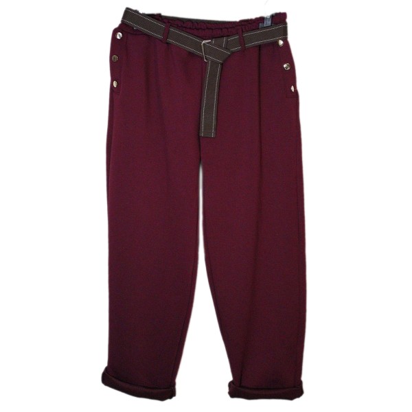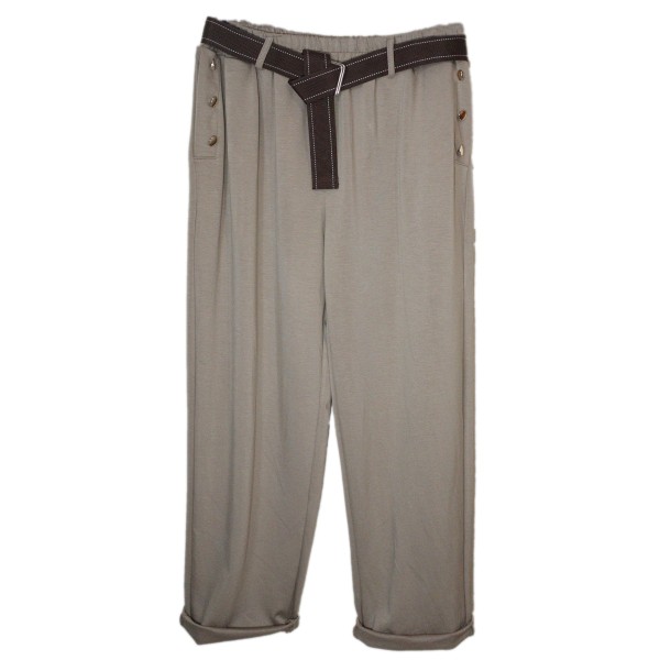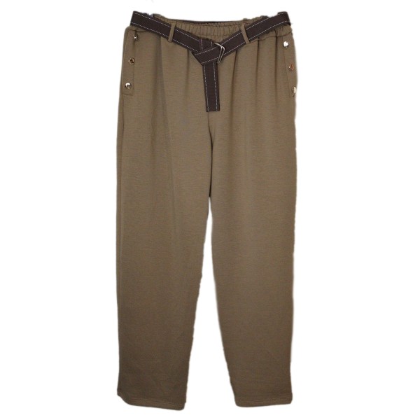 Άνετο μαλακό παντελόνι με λάστιχο στη μέση, ζώνη και τσέπες, διακοσμημένες με τρια χρυσά κουμπάκια. Από απαλό, μαλακό και ελαστικό ύφασμα τύπου baby φούτερ.