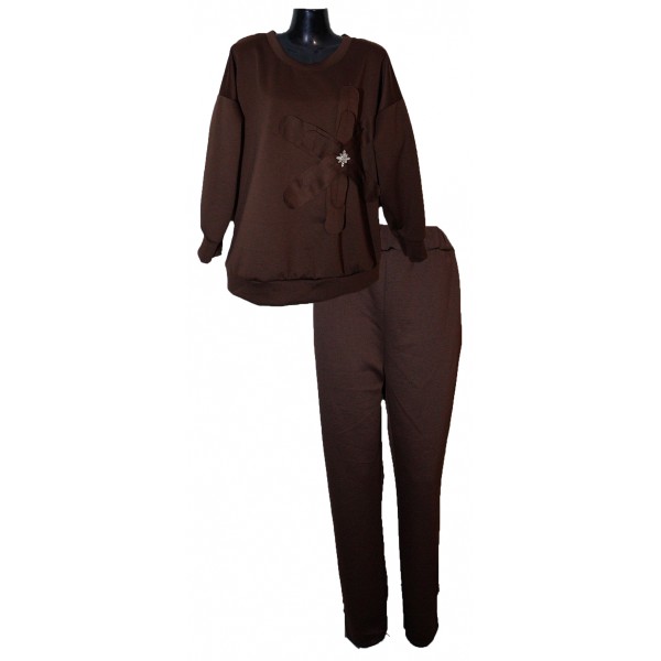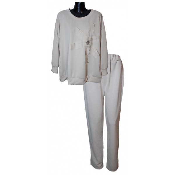 Σετ με υφασμάτινο λουλούδι. Μπλούζα διακοσμημένη με υφασμάτινο λουλούδι και στρας στη μέση, συνεχόμενο μανίκι και μπάσκα στις μανσέτες και στο τελείωμα. Παντελόνι με λάστιχο στη μέση και τσέπες, που στενεύει ελαφρώς προς τα κάτω. Από μαλακό, απαλό και ελαστικό ύφασμα τύπου baby φούτερ.