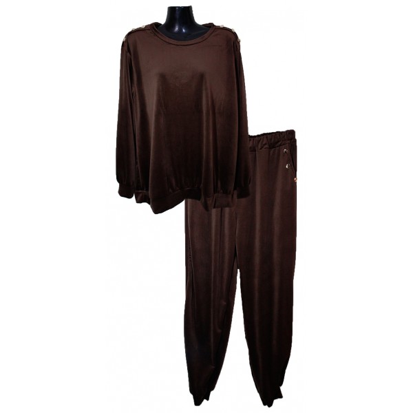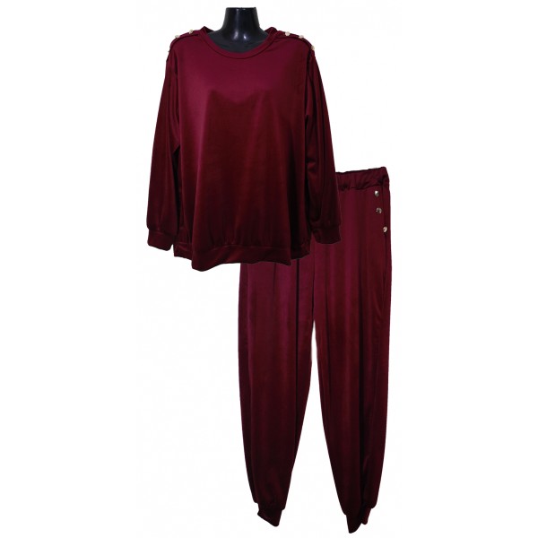 Βελουτέ σετ με διακοσμητικά κουμπιά. Μπλούζα με στρογγυλή λαιμόκοψη και διακοσμητικά κουμπιά στους ώμους, με μπάσκα στο τελείωμα και στα μανίκια, σε ίσια γραμμή. Παντελόνι με λάστιχο στη μέση, τσέπες διακοσμημένες με κουμπάκια και μπάσκα στο τελείωμα.