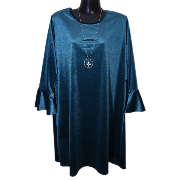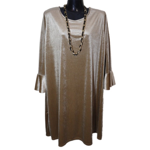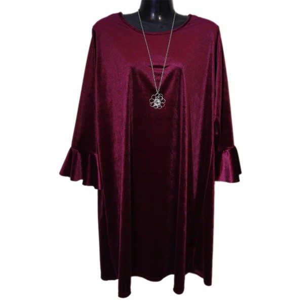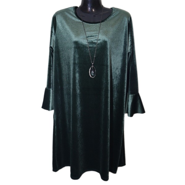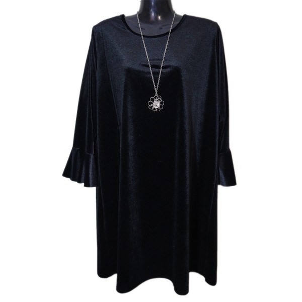 Βελούδινο εβαζέ φόρεμα με βολάν στο μανίκι και ανοιχτή στρογγυλή λαιμόκοψη, από απαλό ελαστικό ύφασμα.